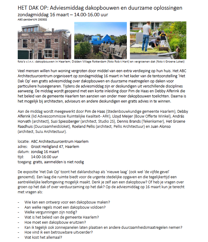 HET DAK OP: adviesmiddag opbouwen en duurzame oplossingen, ABC Architectuurcentrum, zondag 16 maart 14-16 uur